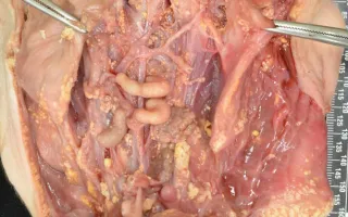 Upon internal examination, two pleural cavities were discovered, with absent lung tissue. There is marked hypoplasia of the gut and urogenital system. The heart and its related structures are characteristically absent. The hypoplastic cranium is fluid filled and largely empty, with some residual brain tissue on the side of the cranial cavity.