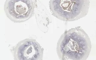 Adenovirus is a nonenveloped virus with a double stranded DNA genome that rarely infects the gastrointestinal tract. It has been described in association with mesenteric adenitis and ileocecal intussusception. In addition, it can induce a marked reactive lymphoid hyperplasia of the appendix that can mimic acute appendicitis clinically. In these cross-sections of the appendix, note the Cowdry type A eosinophilic nuclear inclusions in many of the enterocytes. Immunohistochemistry for adenovirus demonstrates strong nuclear staining within the mucosa.