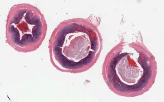 Grossly, pinworms may be visible as small (2 - 13 mm), ivory-white worms with long, pointed tails. Microscopically on cross-section they have a thick cuticle, lateral alae (wings), and visible organs which may include intestines, and ovaries/testes. Eggs may also be seen within female worms or in isolation. They may be differentiated from vegetable matter as their exterior and cuticle does not stain for PAS/PASD.