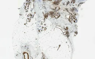This slide shows SMA stain, see Related Content for H&E, CD31, and D2-40 stains.