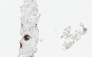 This slide shows the bone marrow biopsy CD20 stain. See Related Content for H&E stain, peripheral blood smear and bone marrow aspirate.