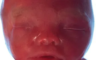 “Fetal facies” with a prominent forehead, flat nasal bride, upturned nose, and triangular mouth, can be seen in the specimen photographs.