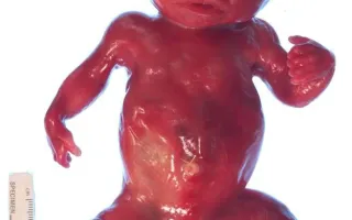 “Fetal facies” with a prominent forehead, flat nasal bride, upturned nose, and triangular mouth, can be seen in the specimen photographs.