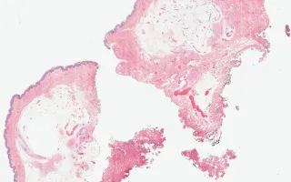 The slides in this case demonstrate five nearly identical lesions from five different body sites: breast, left eyebrow, soft palate, and two vulvar lesions. This slide shows the breast lesion, see Related Content section for slides showing the other lesions.