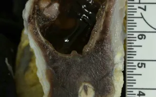 Upon internal examination, two pleural cavities were discovered, with absent lung tissue. There is marked hypoplasia of the gut and urogenital system. The heart and its related structures are characteristically absent. The hypoplastic cranium is fluid filled and largely empty, with some residual brain tissue on the side of the cranial cavity.
