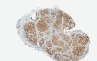 This slide shows synaptophysin stain. See Related Content for H&E, ER, and mucicarmine stains.