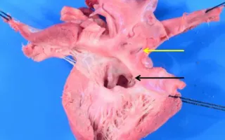 This slide shows the main defect (black arrow) from the left sided chambers. There is also a second smaller defect present in the atrial septum, which could be considered either as a large patent foramen ovale or alternatively as a small secundum type atrial septal defect. A close up and image from the right sided chambers can be found in Related Content.