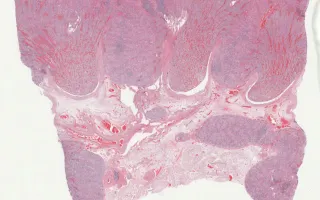 This slide shows H&E stain. See related content for IHC slide.