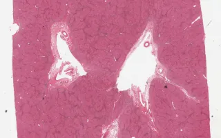 Alagille syndrome is a complex multisystem developmental disorder classically defined by a paucity of intrahepatic bile ducts in combination with three of five major clinical features: cholestasis, heart murmur or structural heart disease, characteristic facial features (eg. inverted triangle facies, broad forehead, pointed chin), vertebral anomalies, and eye findings. The disease may also be associated with renal abnormalities, pancreatic insufficiency and vascular anomalies. Inherited in an autosomal dominant fashion, JAG1 is the most commonly mutated gene associated with Alagille syndrome. The H&E section reveals the absence of interlobular bile ducts in all portal tracts. The CK7 immunostain demonstrates a few small, distorted bile ducts but also demosntrates many positive intermediate hepatocytes accentuated around the periportal regions without ductular proliferation. The CD10 immunostain demonstrates the complete absence of bile duct canaliculi.