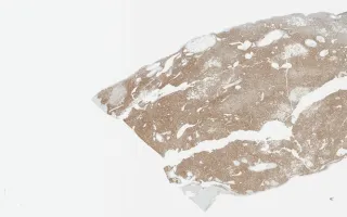 This 70-year-old female had a recent history of resected colorectal cancer. She subsequently developed a 3 cm subcapsular liver mass that was initially suspected to be a metastasis. The mass did not respond to adjuvant chemotherapy, so a diagnosis of hepatocellular carcinoma was favoured. She underwent segment V liver resection.