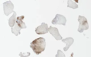 This slide shows CD1a stain. See related content for H&E and S100 stains.