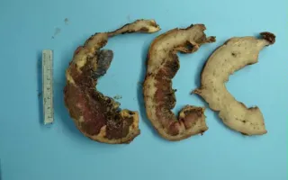 This patient had a history of multiple dilatation and curettages. The placenta was also located such that it partially covered the cervical os (partial previa). Radiologically, placenta percreta was suspected with potential involvement of the urinary bladder. Hysterectomy was performed following cesarean section. On gross sections through the uterus and placenta, brown placental parenchyma is seen extending through the entirety of the tan myometrium to the serosal surface of the uterus. The fetal surface can be identified by its grey-purple colour and vessels.