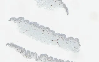 This slide shows CD4 stain. See Related Content for H&E, CD3, CD20, CD7, and CD8 stains.
