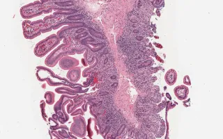 This slide shows H&E stain of the small intestine. See Related Content for H&E stain of large intestine and FOXP3 stain.