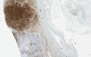 Yolk sac tumours are the most common testicular tumours in infants and young children. They may also occur in adults, usually as a component of a mixed germ cell tumour. Microscopically, yolk sac tumours often have a heterogenous appearance with multiple architectural patterns. This case demonstrates a mixture of microcystic, reticular, glandular/tubular, and solid patterns amongst a variably myxoid stroma. Focal areas consistent with Schiller-Duval bodies are also seen (fibrovascular cores with tumour cells, surrounded by cystic spaces and a second layer of tumour cells, resembling glomeruli). Intercellular eosinophilic globules are also seen throughout the tumour and are composed of alpha-fetoprotein (AFP) and alpha-1-antitrypsin. AFP staining by immunohistochemistry is characteristic of this tumour as seen in this slide. See Related Content section for H&E stain.
