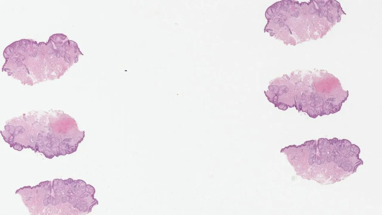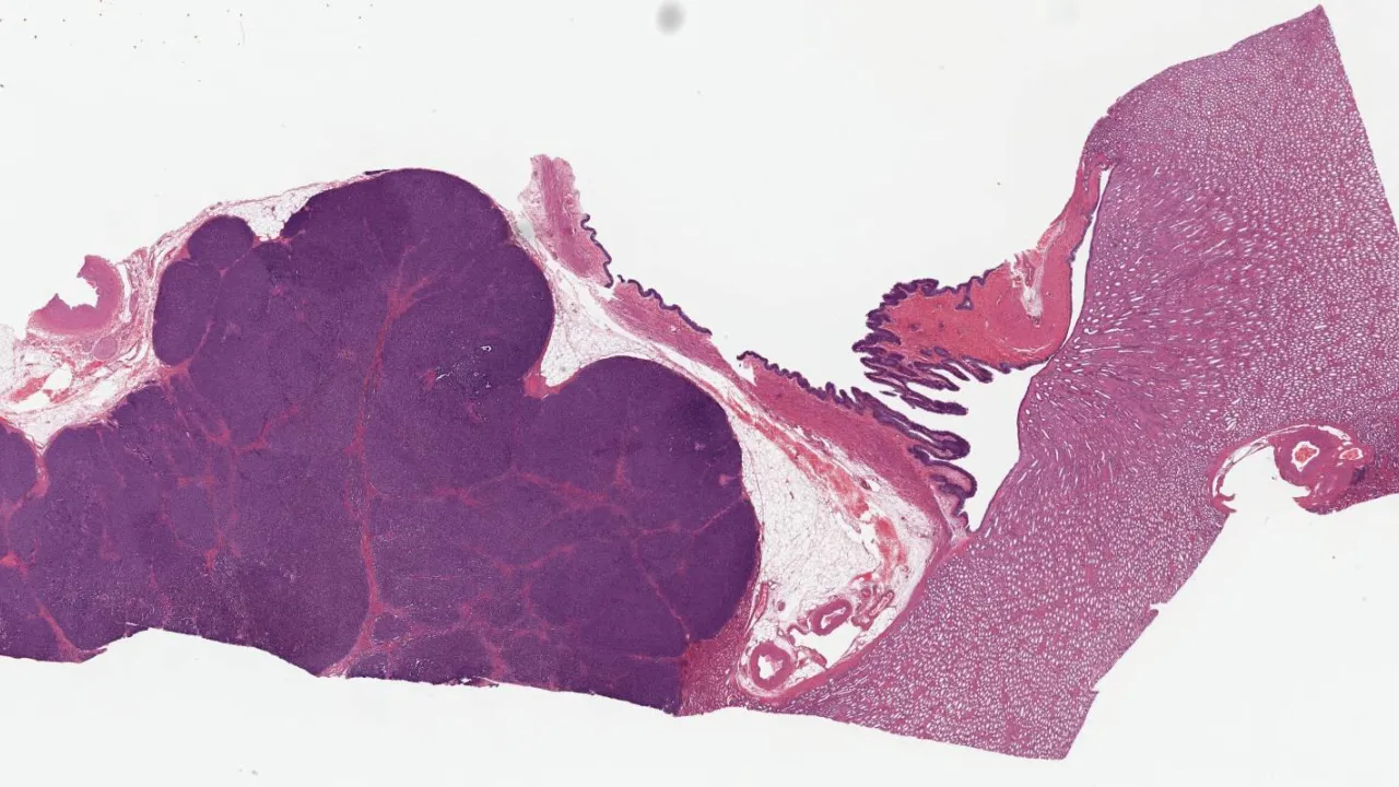 Small intestine, Systemic mastocytosis, H&E stain