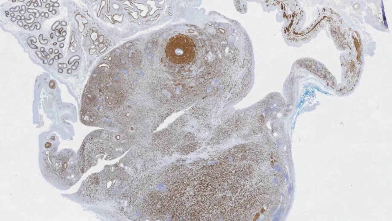 Soft tissue, embryonal rhabdomyosarcoma, desmin stain